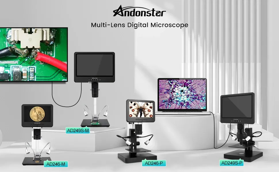 A professional digital microscope with display for electronics repair, micro-soldering and mobile phone board work. The AD246S-M combines a 7-inch screen, 2160P recording and a versatile 3-lens system for clear, comfortable bench inspection.